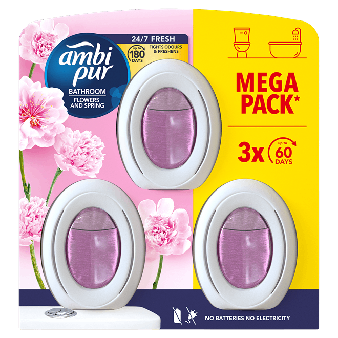 Ambi Pur Bathroom přinese do vaší koupelny příjemnou svěží vůni. Osvěžovač odstraňuje ze vzduchu pachy a současně zabraňuje jejich usazování na měkkých površích, jako jsou ručníky, vany či sprchové závěsy. Díky jedinečné technologii zajistí nepřetržitou svěžest až po dobu 60 dní. Osvěžovač vzduchu navíc funguje bez nutnosti použití baterií či elektrické energie. Provoňte vaši koupelnu výjimečnou vůní pomocí Ambi Pur Bathroom.
