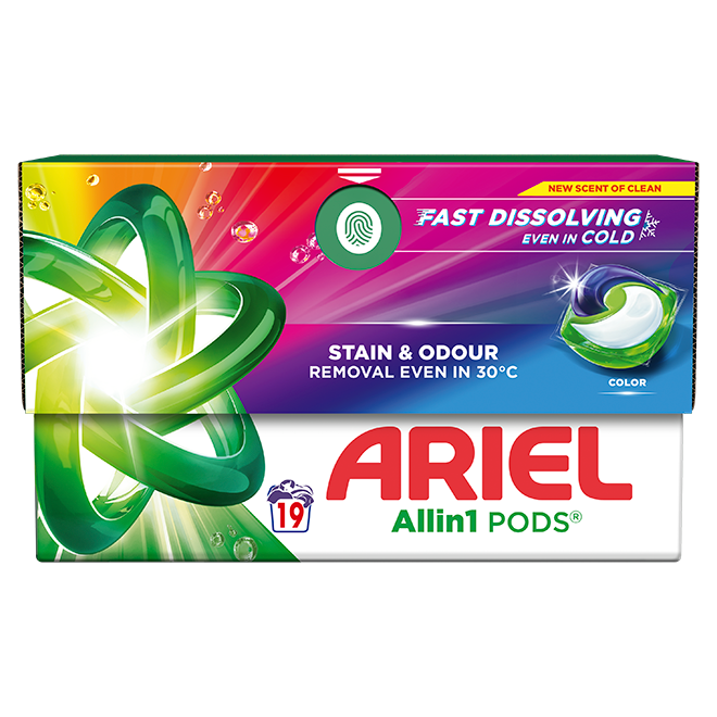 Ariel kapsle na barevné prádlo zajišťují dokonalé odstranění skvrn a jsou speciálně navrženy pro praní při nižších teplotách s unikátní technologií Cool Clean. Po kontaktu s vodou se obal kapslí 100% rozpustí a uvolní účinné látky, které odstraní skvrny z prádla a dodají prádlu příjemnou svěží vůni. Balení je dobře recyklovatelné, jelikož obsahuje maximálně 5 % plastu a přitom je navrženo tak, aby kapsle bezpečně uchovalo. Kartonový obal Ecoclic tak pomáhá snižovat množství plastů.