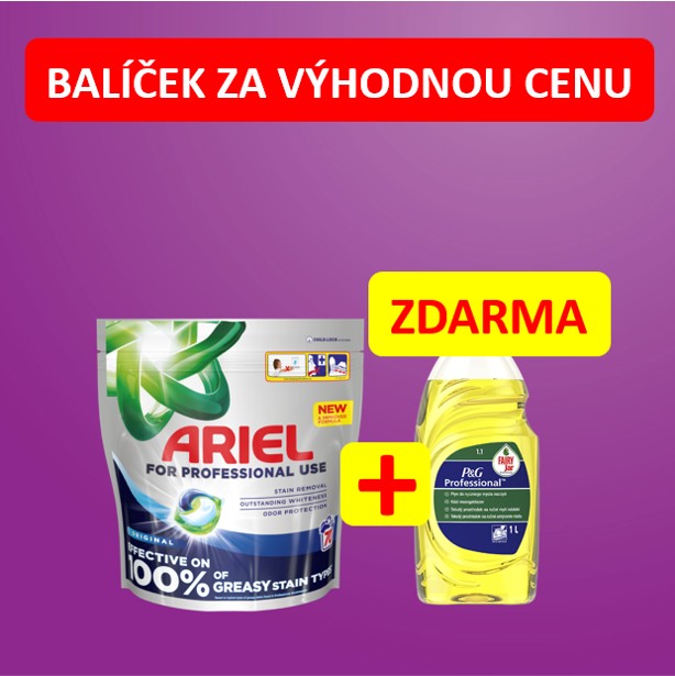 Gelové kapsle na bílé prádlo Ariel Professional pro profesionální provozy přichází s inovativním obalem ve formě kapslí s jemným filmem na povrchu. Obal se při kontaktu s vodou úplně rozpustí a uvolní účinné látky odstraňující široké spektrum skvrn. Kapsle má unikátní vícekomorový design, který udrží jednotlivé složky stabilně oddělené do doby, než se namočí. Nejvýkonnější tekutá forma Arielu. Jednoduchý způsob dávkování umožňuje přesnou kontrolu nákladů. Účinný už při teplotách od 30 °C. Perfektně účinkuje při všech úrovních tvrdosti vody. Proniká do hloubky vláken a udržuje prádlo zářivě bílé i po mnoha vypráních.