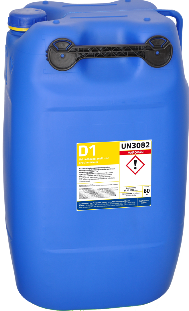 Základní tekutý prací prostředek s optickými rozjasňovači D1 pro systém Professional support. Bezfosfátové a neionogenní složení zlepšuje kvalitu vypouštěné odpadní vody. Je vhodný pro všechny druhy prádla. Přímá aplikace nepoškozuje textil, neobsahuje bělidla či fosfáty. Dosahuje vysokého odmašťovacího efektu. Je navržený speciálně pro prádlo z hotelového a nemocničního prostředí. Může se dávkovat ručně či automaticky. Je vyvinutý primárně pro systém Professional support a určený především pro profesionální prádelny. Nastavení a instalaci provádí technik Professional support.