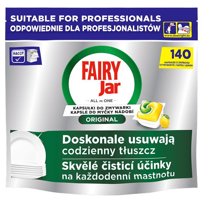 Kapsle do myček nádobí Jar Professional Original (All in 1) jsou vyvinuty pro mytí nádobí v myčkách jak pro domácí tak pro průmyslové použití (mycí cyklus 1-5 min.). Účinně myjí dokonce i zaschlé skvrny od rtěnky, kávy a čaje. Rozpouštějí se 2x rychleji než běžné pevné tablety. Povrchově aktivní látky zajistí dokonalé odstranění zbytků jídel a mastnoty z nádobí a zabraňují jejich opětovnému usazování na příborech, talířích a skle. Účinné při všech stupních tvrdosti vody. Obal je recyklovatelný. V souladu s HACCP.