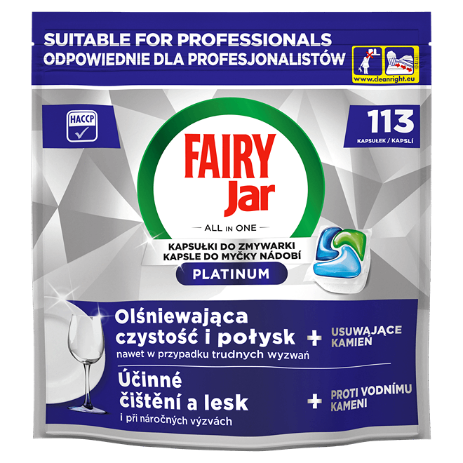 Kapsle Jar Professional Platinum jsou vyvinuty pro mytí nádobí v automatických myčkách. Povrchově aktivní látky zajistí dokonalé odstranění zbytků jídel a mastnoty z nádobí a zabraňují jejich opětovnému usazení na příborech, talířích a skle. Účinně čistí filtr a zanechávají myčku čistou a nádobí perfektně lesklé. Rychle se rozpouští a jsou účinné při všech stupních tvrdosti vody. Není potřeba je rozbalovat. Obal je recyklovatelný.