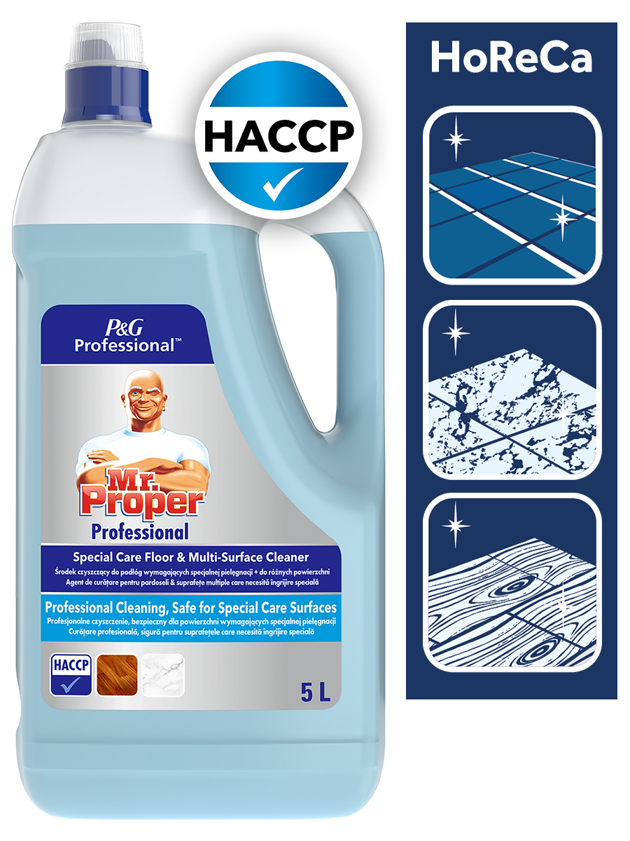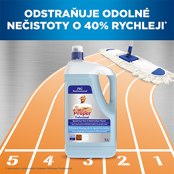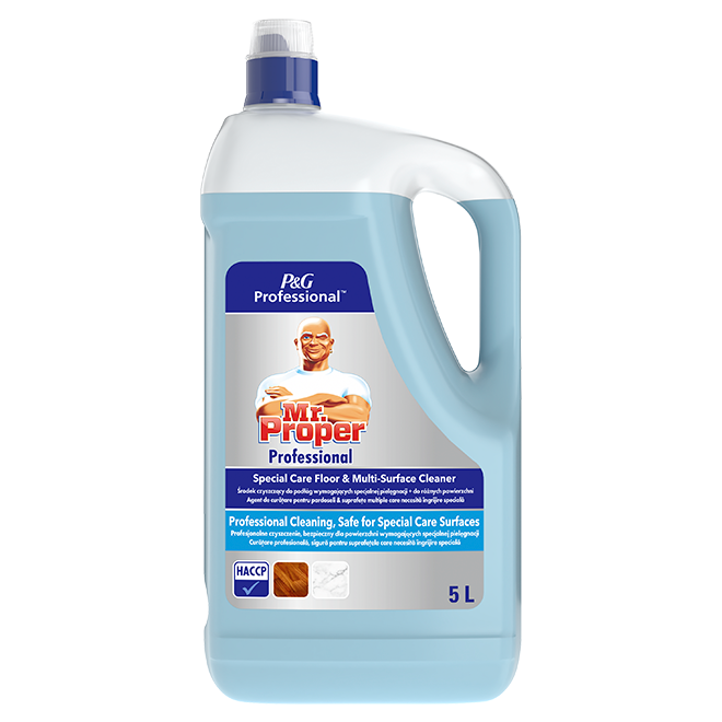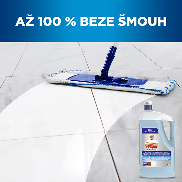 Univerzální profesionální čisticí prostředek Mr. Proper Professional na podlahy a citlivé povrchy. Díky inovativní technologii účinně odstraňuje nečistoty a dosahuje vynikajících výsledků i při čištění citlivých povrchů včetně mramoru, přírodního kamene a keramiky. Může být použitý ředěný i neředěný. V případě použití zředěného produktu není potřeba další oplachování. Je vhodný také na použití v automatických strojích na čištění podlah. Zanechává dlouhotrvající lesk a svěží, příjemnou vůni. Jedna 5L láhev vystačí po naředění na 83 pětilitrových kbelíků čisticího prostředku.