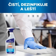 Dezinfekční víceúčelový čisticí prostředek Mr. Proper Professional 3v1 - čištění, lesk a dezinfekce v jediném spreji. Je připravený na okamžité použití. Zabíjí 99,99% bakterií a virů za 15 sekund * Účinně odstraňuje skvrny a otisky prstů na vnitřních plochách jako jsou stoly, pulty, stoličky, telefony, kliky od dveří, skleněné předměty. Nezanechává žádné šmouhy. Povrchy jako sklo apod. není po aplikaci potřeba oplachovat.