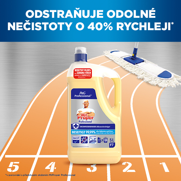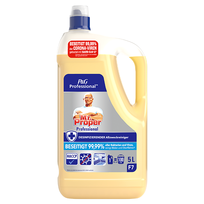 Univerzální profesionální dezinfekční čisticí prostředek Mr. Proper Professional na podlahy a omyvatelné povrchy. Likviduje 99,99% bakterií, obalených virů a plísně.* Vhodný pro povrchy, které přicházejí do kontaktu s potravinami. Může být použitý ředěný i neředěný, je možné ho použít i do podlahových čisticích strojů. V případě použití zředěného produktu není potřeba další oplachování (mimo povrchy přicházející do kontaktu s potravinami). Perfektně čistí a odstraňuje nečistoty i mastnotu. Zanechává dlouhotrvající lesk a svěží, příjemnou vůni. Jedna 5L láhev vystačí po naředění na 100 pětilitrových kbelíků čisticího prostředku pro běžný úklid nebo na 33 kbelíků pro úklid s dezinfekcí. Pro vyčištění těžko odstranitelné nečistoty použijte houbičku a neředěný prostředek, povrch očistěte a potom opláchněte vodou. V souladu s HACCP.